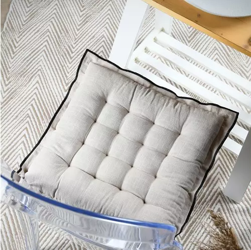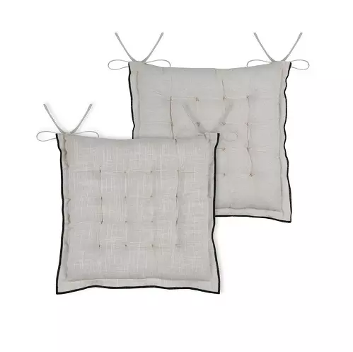 Cojín de silla de doble cara: un lado con estampado y el otro lado en color liso. El tejido exterior es 55 % algodón y 45 % poliéster, mientras que el relleno es guata de poliéster. Tiene cordones en las dos esquinas para sujetarlo a la silla. Combínalo con los demás artículos del mismo conjunto para crear un efecto único. Medida 38x38cm