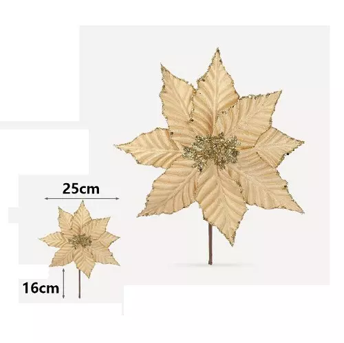 Dale un toque elegante y tradicional a tu decoración navideña con esta hermosa flor de Navidad. Con un diseño amplio y acabado brillante, es perfecta para adornar árboles, coronas, centros de mesa o cualquier rincón festivo.