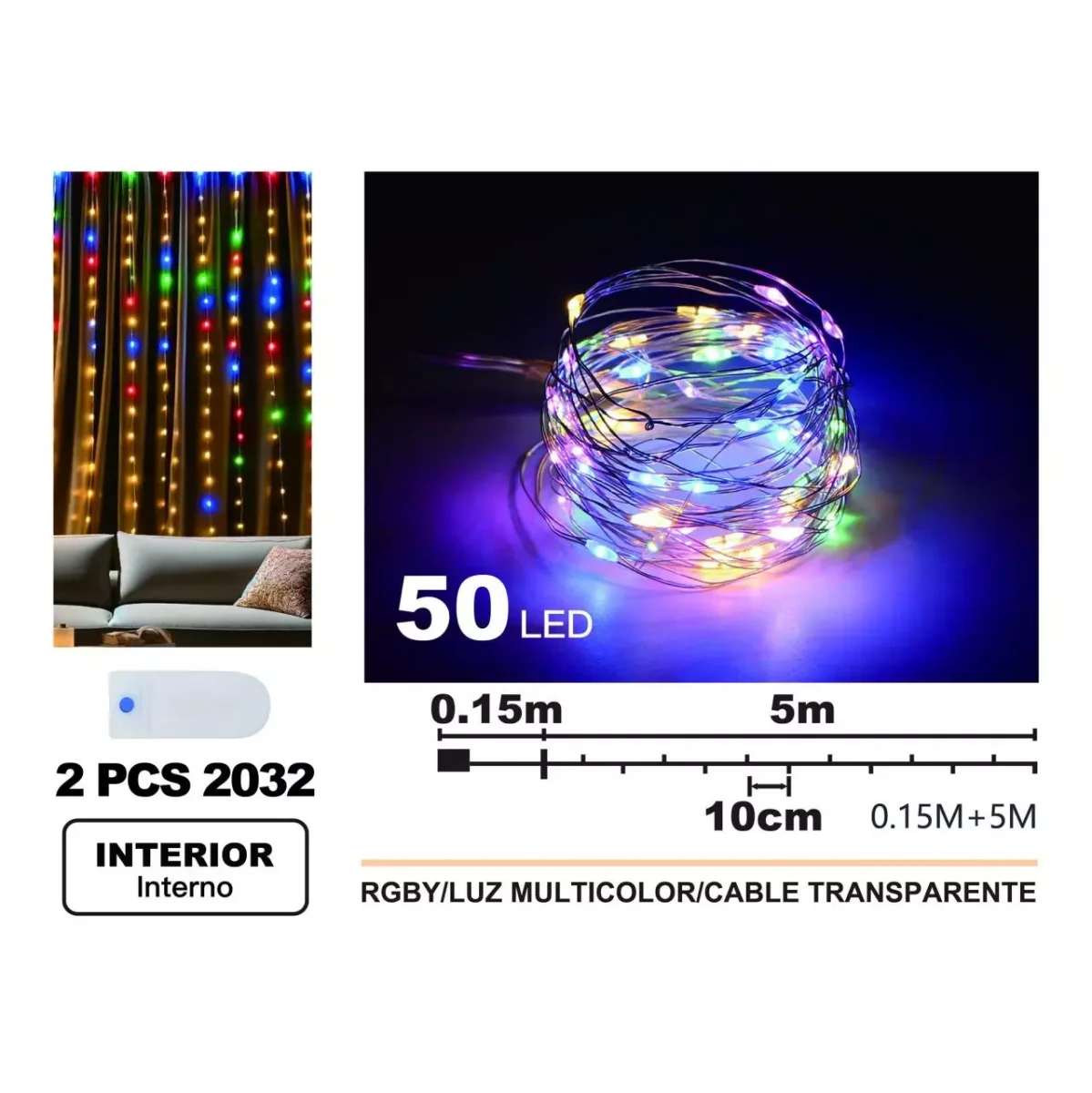 Tira de luces de alambre de cobre, 50 LED en colorida RGBY. Funciona con 2 pilas de botón CR2032. Medida largo 5,15 m.