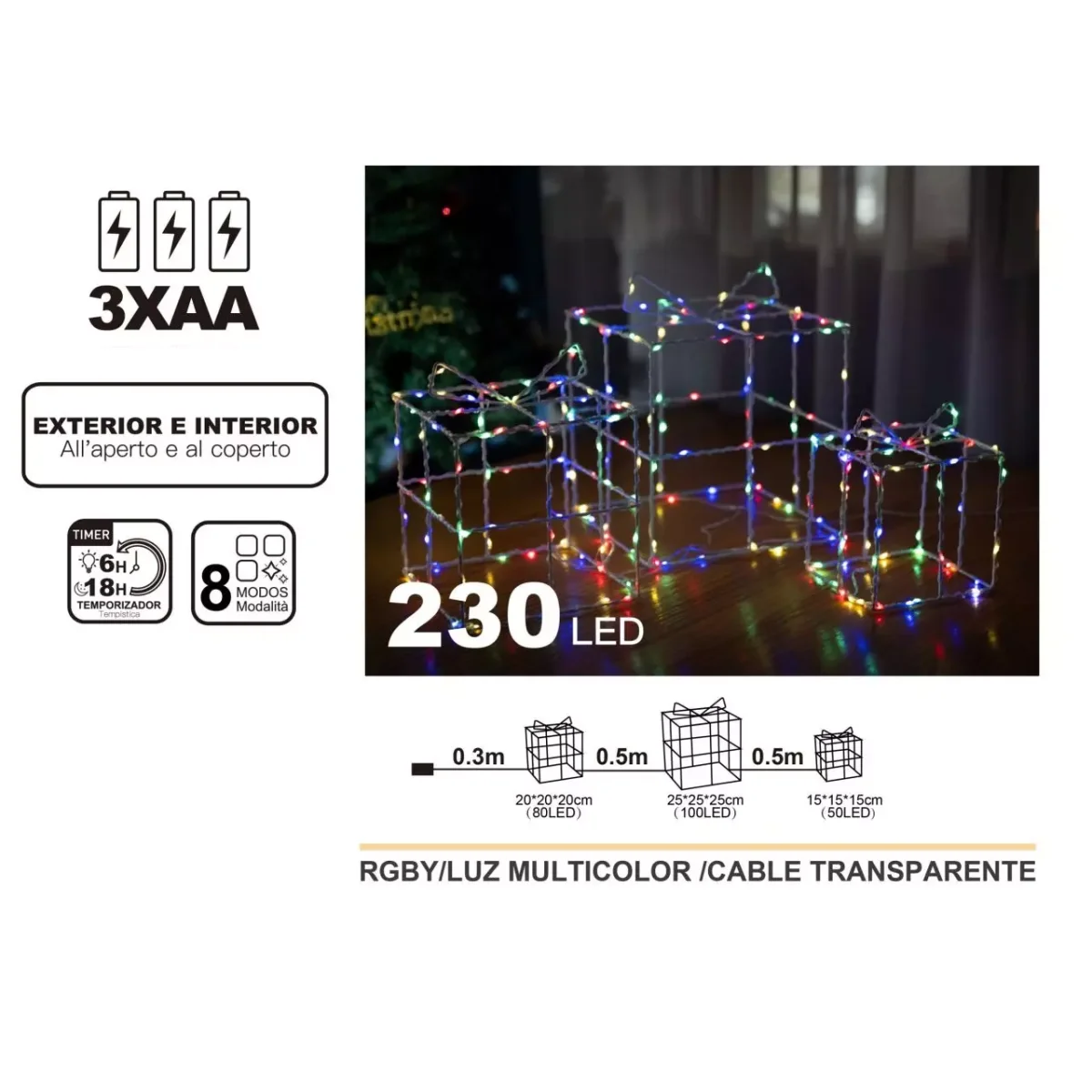 Set de 3 cajas de regalo en cadena de luces, 230 LED en colorida RGBY. Funciona con 3 pilas AA (no incluidas). Medidas de cajas 15x15cm, 20x20cm y 25x25cm
