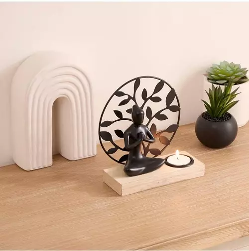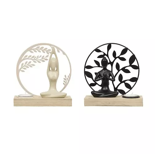 El set Yogi está compuesto por una estatuilla de hierro fundido de inspiración exótica, realizada en un estilo depurado. Está montada sobre una base de madera natural que contiene un espacio para una vela de té. Coloca este set en una consola de entrada para disfrutar de un ambiente positivo y relajante.