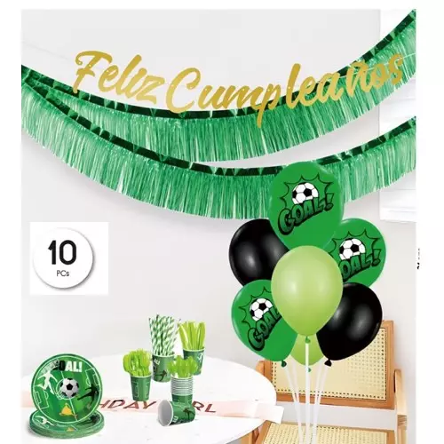 Set de decoración, pack de globos surtidos con guirnalda de flecos metalizados en color verde (3m). Preparar una fiesta de manera fácil, rápido y bonito.